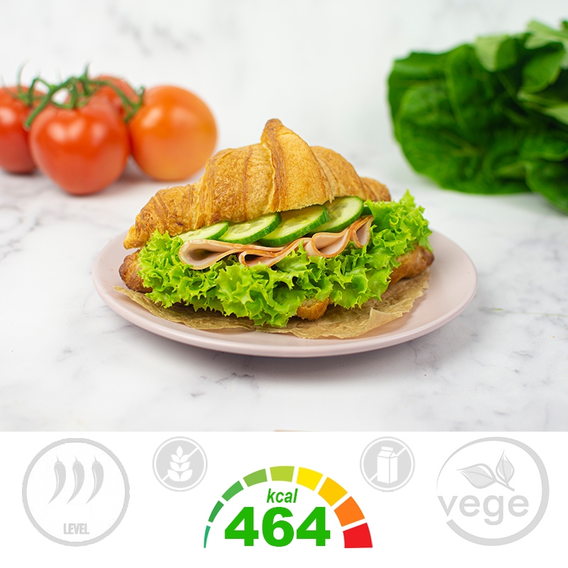 Składniki: Croissant 46,4% (mąka: PSZENNA, prażona słodowa, JĘCZMIENNA, woda, oleje i tłuszcze roślinne: palmowy, słonecznikowy; syrop glukozowo-fruktozowy, drożdże, masło /MLEKO/, cukier, JAJA, siemię lniane brązowe, nasiona słonecznika, sól, nasiona maku, siemię lniane żółte, nasiona dyni, ziarno SEZAMU, GLUTEN PSZENNY, naturalny aromat, enzymy, środek do przetwarzania mąki: kwas askorbinowy), Szynka z indyka 20,6% (filet z piersi indyka 60%, woda, skrobia, sól spożywcza, białko SOJOWE, substancja zagęszczająca: karagen, glukoza, wzmacniacz smaku: glutaminian monosodowy, maltodekstryna, stabilizator: trifosforany, błonnik bambusowy, przeciwutleniacz: izoaskorbinian sodu, aromaty, substancja konserwująca: azotyn sodu), Ogórek 13,8%, Suszone pomidory 6,9% (suszone pomidory, olej słonecznikowy, sól, ocet spirytusowy) 100%), Mix sałat 6,9% (mix sałat (rukola, cykoria escarola, endywia frisee, radicchio), Majonez 5,5% (olej rzepakowy, olej SOJOWY, ocet spirytusowy, żółtko JAJA, przyprawy (GORCZYCA), sól, regulator kwasowości: kwas cytrynowy, naturalny aromat, sól wapniowo-disodowa EDTA).